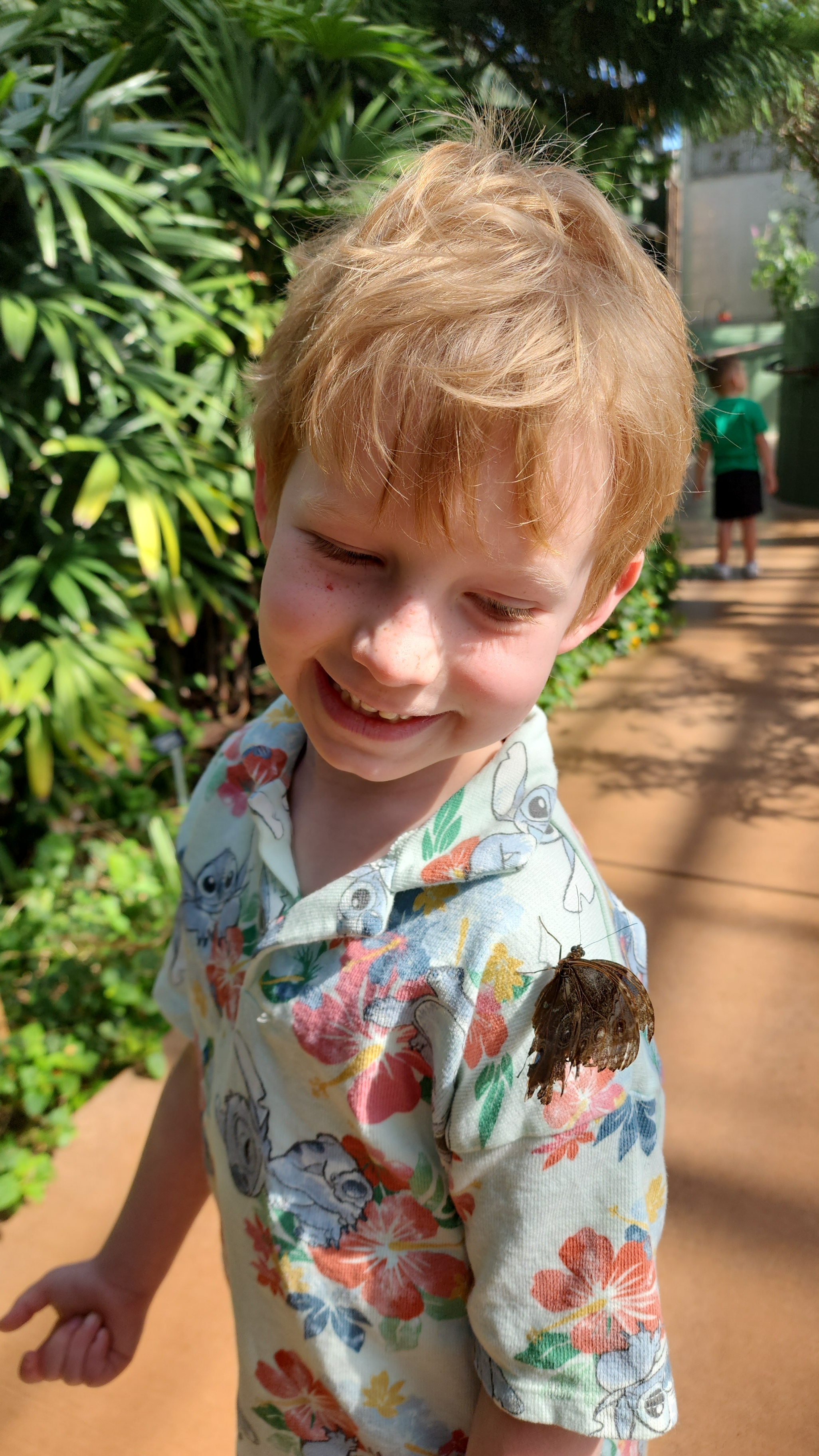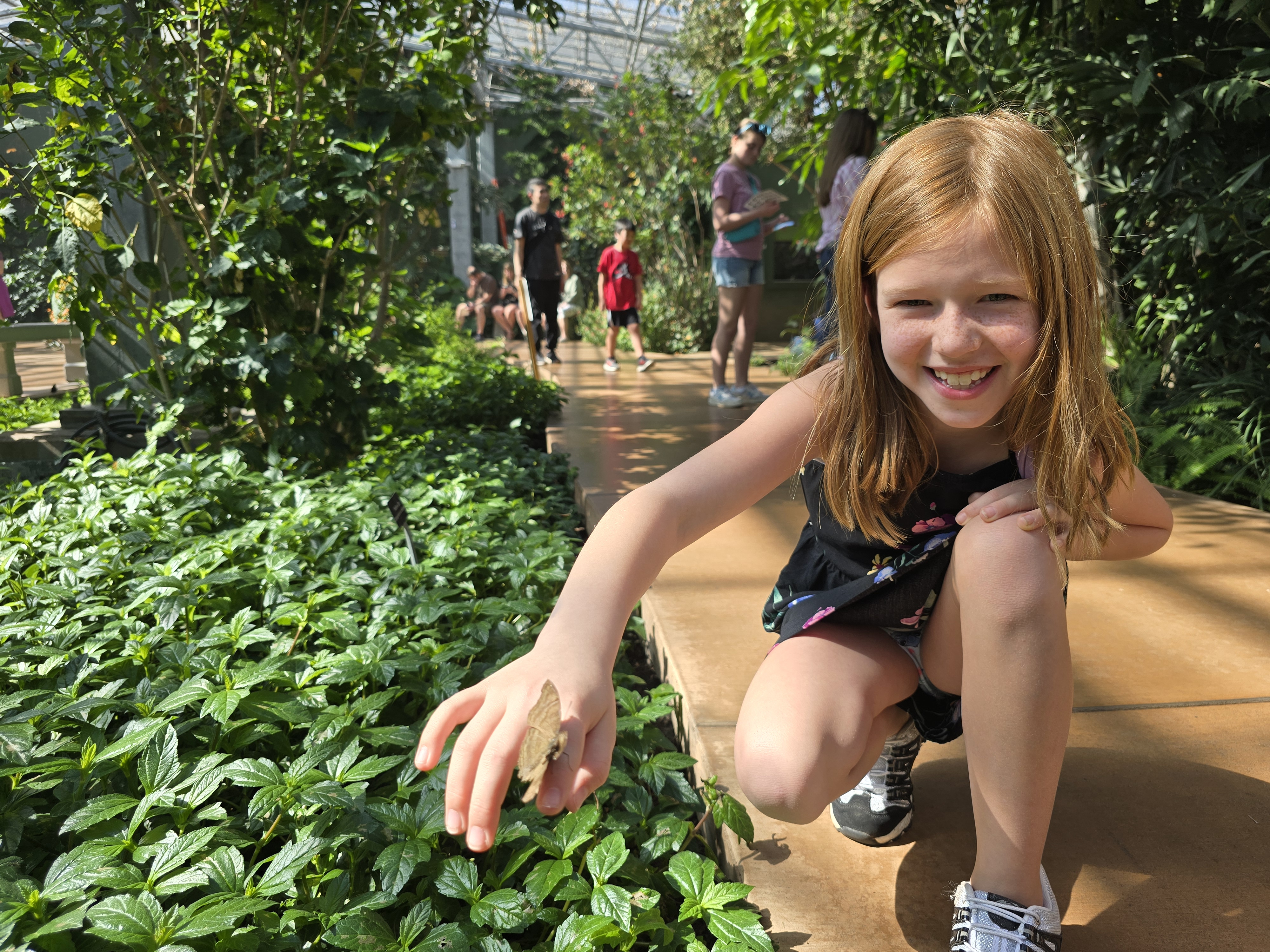 After the movie, we made our way into the indoor butterfly garden. It felt almost magical stepping into the space these butterflies call home, with them fluttering all around us. The kids had the best time watching them land nearby and trying to get them to walk onto their fingers.