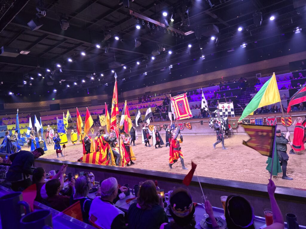 We were cheering for the red and yellow team, and Noelle especially got into the excitement of it all. Lincoln spent much of the show looking around and taking everything in. Meanwhile, Noelle was fully invested in the cheering and the storyline. She especially loved all the drama with the blue team betraying the king and queen. The actors did such a good job that the kids really thought it was real.